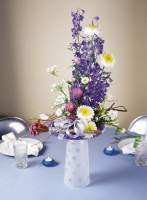 Thank you! Me all happy now! Another thing you can incorporate if you are a blue person is the tall skinny blue flower Belladona Delphinium. It's actually a very pretty small happy flower that looks great as an add in for centerpieces. I've seen it used a couple of times before and always liked it. It can work with a lot of different combos (obviously the arrangement below is total yuck and is way too casual but i just wanted to show you that one blue flower):
