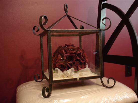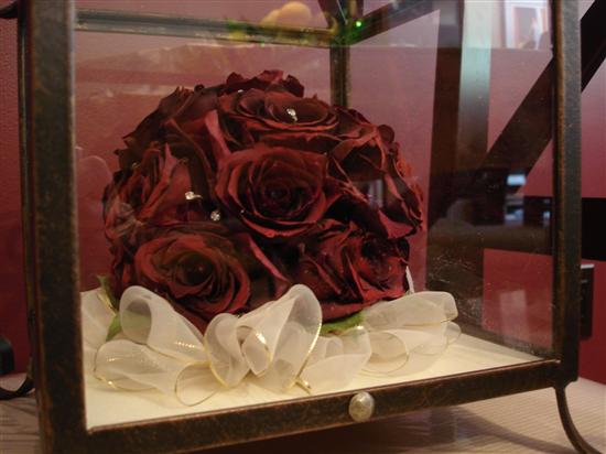 I feel in love with the Keepsake Floral's preservation and I love their shadowboxes too, but for me, I like that this can be a display piece that doesn't 'scream' wedding to everyone (well, except for me!). It is obviously smaller than my real bo-k, but in person the detail is amazing. I had them add in the white/gold organza ribbon. The only thing I wasn't happy with was that one of my crsytals came out of the bo-k and it's resting on the side. But you can't see it and they told me I could open the base and fix it myself.