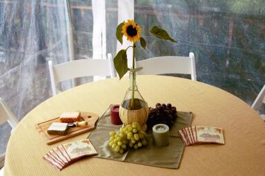 The grapes on the table were real. The ones hanging up were fake. Someone mentioned a platter or hurricane with grapes or ivy spilling over it - that could be a nice touch.