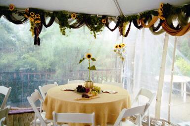 - Current CP: Sheer-ish Champagne colored runner over a white tablecloth. Large Wine glasses in the center of the table with floating gardenias and peonies in them. Lots of votive candles scattered around the glasses.