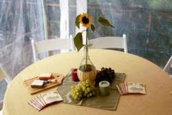 I think the floating flowers in the wine glasses sound great. At my shower this weekend, which had a Tuscany and wine theme, my MOH did something I thought was really creative. She found chianti bottles on E-bay and placed sunflowers in them and then decorated the tables with candles and grapes. Maybe you can do something along these lines.