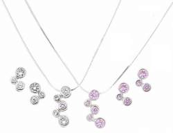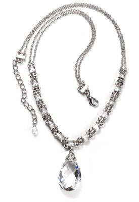 Chandelier earrings and no necklace, or if your gilrs are wearing their hair up maybe one of those 'back' necklaces that hangs down the back, and smaller but still dangly earrings.
