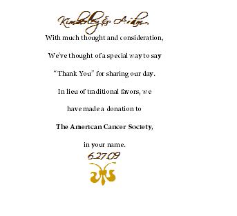 That is the same thing I am doing. I am doing chocolate cookies as a lil something in addition to the donation. I am using the same wording.Unfortunatley I am going to have the donation 'saying' by the guest book and just the chocolates on the table is that ok?