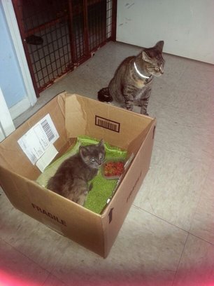 Here is a picture of the kitty my friend found in his apartment complex's backyard. The kitty is in a warm, safe home right now. My friend is waiting for a nearby shelter to come get him. The big cat in the picture is his(she's not up for adoption ).Spread the word,