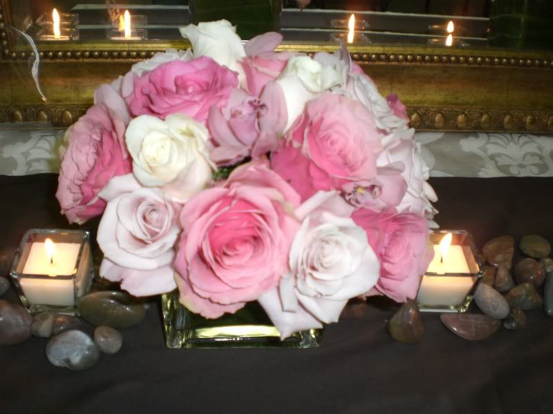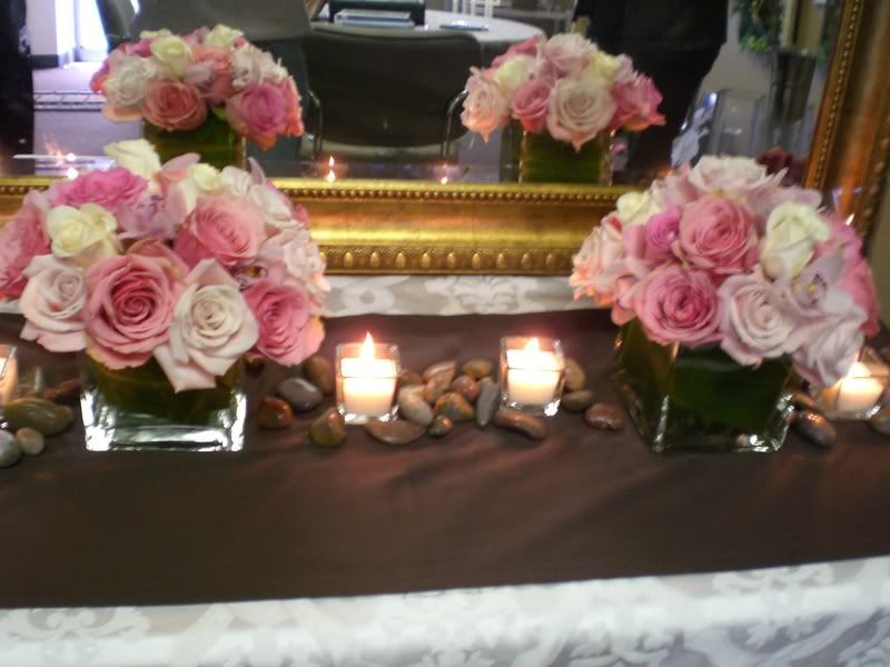 ) our colors are Light Pink, Champagne, and Chocolate Brown. What if my Bridesmaids all had light pink rose bouquets, my MOH had light pink and cream rose bouquet, and I had an all cream rose bouquet? Id love any ideas of what kind of accents would look good in this..Also our low centerpieces were going to be light pink tulips in a globe vase... I am thinking that I could possibly do the tulips in light pink with cream roses throughout.. let me know if that sounds too weird.. or if you have pretty pictures of low centerpieces with just roses...
