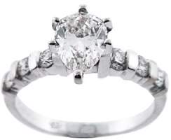 Ring: princess cut set in platinum w/ 2 small round diamonds on each side.