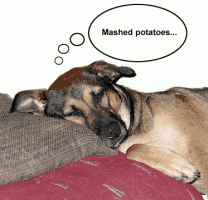 the puppy was dreaming of mashed potatoes, turkey, stuffing, etc......it's supposed to change sayings, but I couldn't get the animation to save.