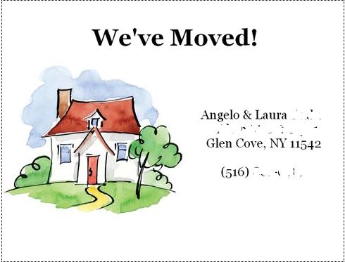 What I did was make it like one of the cards you get at Christmas.I took a picture of our home & then put on card..we moved & the new address. it came out really cute & then everyone can see your new house picture.