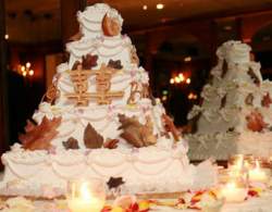 OUR CAKEDh's cousin is acutally a pastry Chef at Le Cirque in the city. We couldn't afford a customized cake, but really wanted to have that Asian touch to it. Our RH package came with a cake already, so I asked for that was UNDECORATED, and DH-cousin would do the rest. I emailed her some pictures of cakes I found on the Net, mainly with fall themes and leaves (we got married in the fall, and his name in Chinese means 'LEAF'). I also fell in love with a cake 'monogram' I once saw on the forums that had a 'Double happiness' symbol between the B&G's initials. This was her interpretation of it.