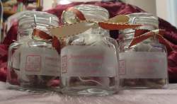 For our favors, I put tea bags from Harney and Sons, a Tea company in Upstate NY into little snap lock jars. I got the jars from a wholesaler on eBay for less that $1 a piece. Harney makes this wonderful tea called 'The Wedding Blend'... I thought it was very appropriate. I also put in 'Chinese Flower' and 'Strawberry Kiwi' (wanted to have a non-caffienate choice for my guests).As for the labels, DH took care of that a few late nights at his workplace