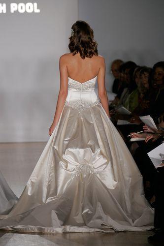 In person the skirt is much more ballgown and full (the store told me the runway model wore a first edition of the dress which has been tweaked a bit since). In addition, the permanent bustle you see in the back will not be in place on my dress, I ordered it without the sewn bustle. Instead it will be flat in the back and will have a double french bustle for the reception.