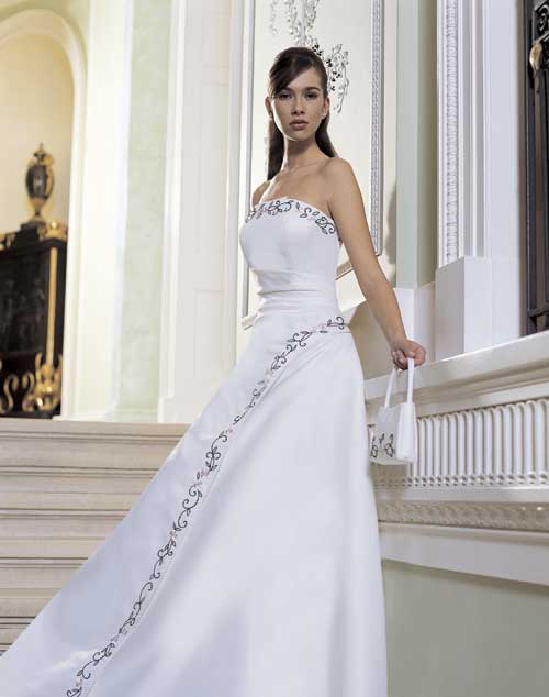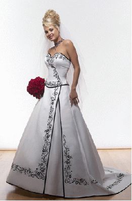 Now with all of this Black and white look going on in my wedding party, I was thinking about taking it one step farther. I want my dress to be some kind of white with Black detailing. Does anyone know where I can find a dress like that?