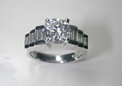 My engagement ring is a family heirloom that belonged to my husband's great grandmother. It is just under 2 carats set in white gold. It is round, but with the 4 prongs it sometimes makes it look almost square.My wedding band is 1/2 carat. It's set in platinum. It is our hope to one day reset the diamond in the engagement ring to sit flush with my band.
