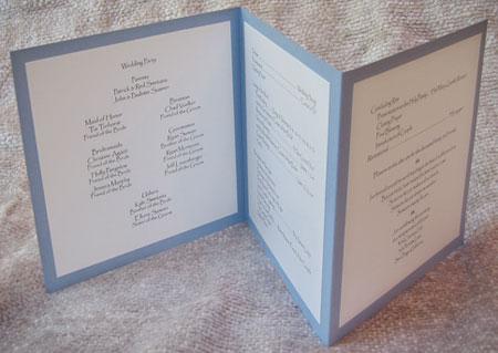 Ok, I want to use the Ennvelopments 5X7 pocket fold invitation as a program- because I just love the way it looks and I already have an invitation by KOZA picked out. Here's the thing I don't know what I should put in the folder for the program- any ideas besides directions from the church to the reception?Here's a pic for those of you not familiar with Envelopments, notice the pockets.