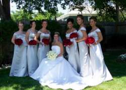 We did this for my cousin's wedding - The end of july. Our BM gowns were more of a platnium color .....VERY light silver w/ purple/lavendar flowers. - I'll try to get some pics scanned for you - it was 3 years ago...WAY before my digital camera !!