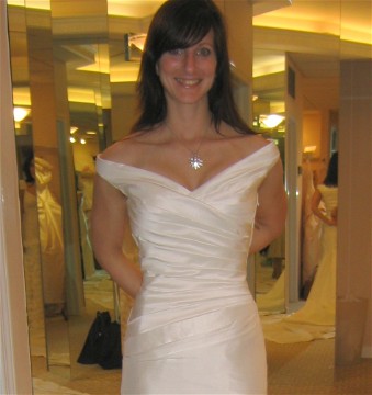 I was looking for a scoopneck dress. I found one at Bridal Garden that is just slightly off the shoulder, so that I could still move my arms up enough to dance.