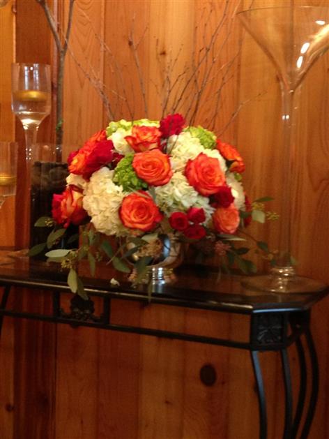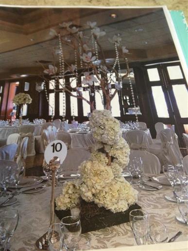 I'm having a mixture of manzanita centerpieces with white/light green hydrangeas, orange circus roses on the branches, and crystals dangling from them like the pic below, and tall crystal pedestals with the same type of flowers. The manzanita we got for 200 each, and the pedestals we got for 145 each. The short centerpiece we decided not to go with but our florist quoted us 120 for it
