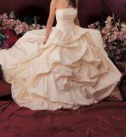 The style number is 8153. The color of the dress is Champagne. It is a size 10 from the factory. The dress was altered to have a French bustle.