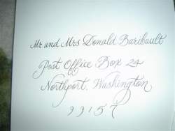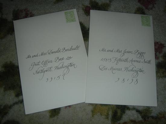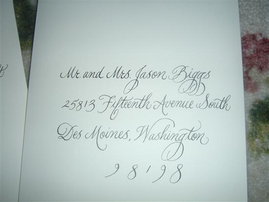 I got my hand calligraphy done by Wendy Trout from Trout Designs. The envelopes came out absolutely beautiful!!! She charges $1 to $1.50 for inner and outer envelopes together!! What a deal!! I had Spencerian script so it was $1.50 an envelope. I am attaching pics which do not do the envelopes justice because the flash reflected off of them. Thank you to Summerbride06 for the great recommendation. She lives in Williamsville, NY so I mailed the envelopes to her and she mailed them back (cost only 14 dollars priority mail round trip) She mailed me samples and since I wanted it more simple, she did exactly what I asked!! Wendy's e-mail is [email protected] if anyone is interested!!