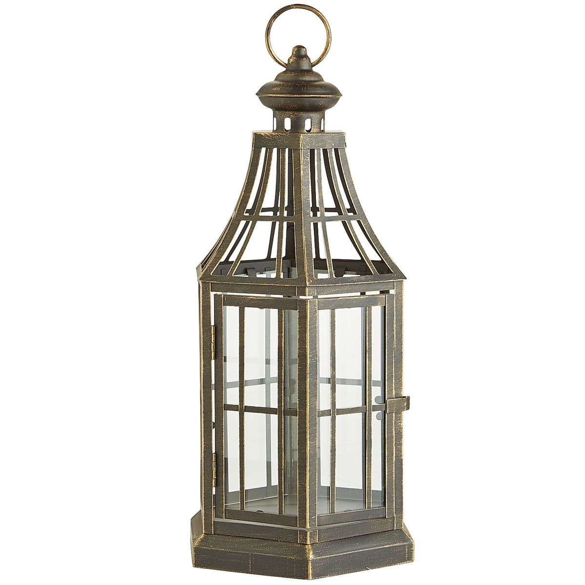 - 15 black and gold swooped rooftop lanterns - 7.25"W x 6.50"D x 15.25"H. Lanterns are iron and glass, hand-painted, and rust-resistant with an all-weather powder coated finish. They can be used indoors or outdoors. Each lantern contains a 3x4 or 3x6 pillar candle on a bed of moss- $300 for all