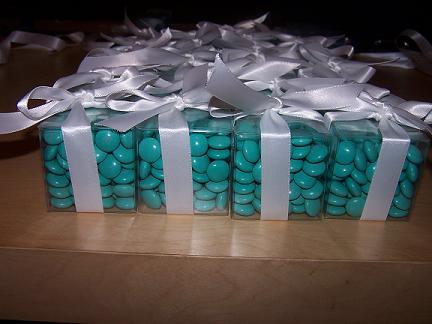 I was thinking of doing this also as a little extra for the table. My colors are pink and green so i will do them. Also you can get them personalized with the date or anythign you want on the other side. You just go to www.shop2.mms.com. I like those boxes and ribbon. Do you know where they are from or did you just find the pic??