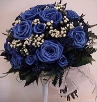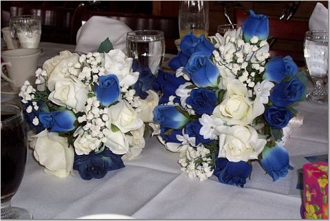 i do wedding flowers as a small side business and i wouldnt recommend blue roses. most of them are chemically sprayed blue and it just NEVER looks natural. some florists use stem dye so that the color wont run (it gets sucked up the stem instead) but its still never all that natural looking.if you want a natural blue i highly recommend blue hydrangea maybe paired with cream roses and callas. hydrangea is the only naturally BLUE flower.