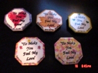 I made these ceramic refrigerator magnets myself...not very elegant, but hopefully they'll get stuck on the fridge! They are all different. I'm going to wrap them in toule with ribbon, and I'm also using bud vases around the tables that can be taken home as favors...geez you have to make these pics small! They are actually 2.5X2.5 inches big. and they say, 'to make you feel my love' which is our song, along with our names and date at the bottom...