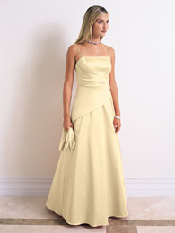 Satin…spaghetti straps…princess line gown featuring wrap detail…sweep train…built-in crinoline…fully lined.