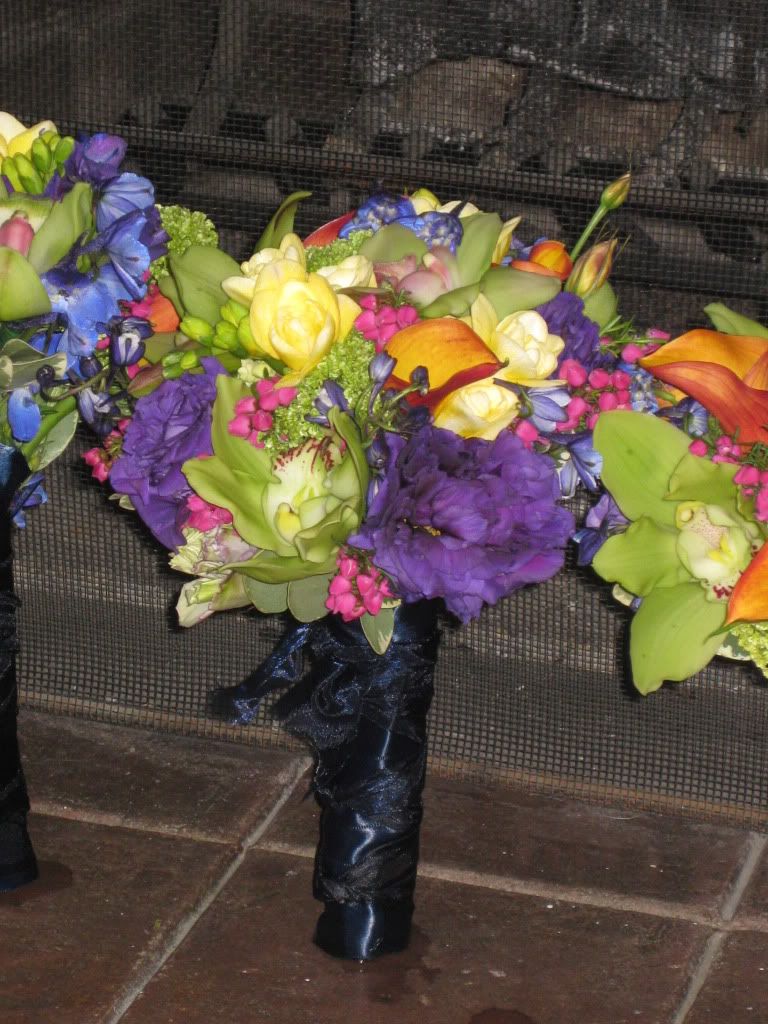 I dont' have a pic of it, but my friend did round bouquet's all of roses....the outside row was dark pink roses, the middle row was light pink roses and the middle cluster was red roses....it looked awesome with the navy blue dresses we wore.