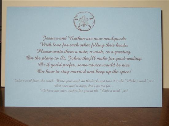 I made 'make a wish' and 'take a wish' jars (I used apothecary jars). Blank cards for guests to fill out and leave for us in the the 'make a wish' jar and we printed our wishes for guests to take from the 'take a wish' jar.