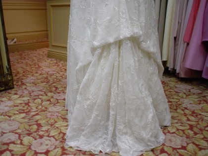 Betty, my dress was organza & had work on the bottom. The seamstress at the bridal shop did a regular bustle for me & it held fine. And I danced ALL NIGHT!I don't think I have any good shots from the back, tho. I'll look!