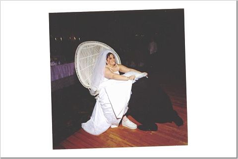 Here I was trying to take off my pearl necklace, and my hair got stuck in it! The DJ was patiently waiting at the front of the room as everyone tried to untangle me! :)