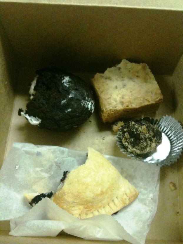 What you see is an oreo whoopie pie, a blondie which is MmmMMmm, a chocolate cake ball and a blueberry mini pie thing.