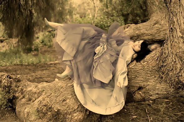 shes laying on the railing. her train is cascading over.