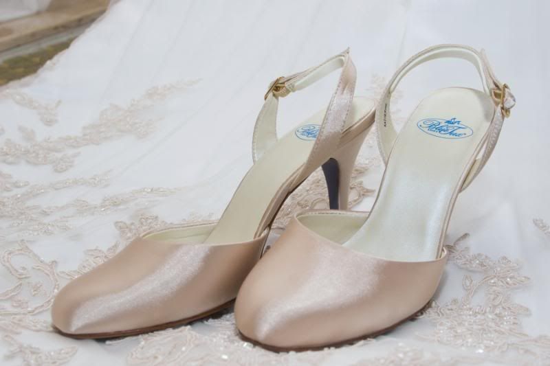 I tried several pairs of shoes that were beautiful but killed my feet! I ordered two pairs from Blue Tux and ended up going with these because they matched my dress so perfectly without needing to be dyed and they were relatively comfortable. I switched to platform flip flops immediately after the ceremony so I really only wore these for about an hour!