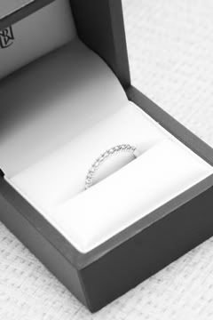 Since we had such a good experience with bluenile when choosing my e-ring, we also ordered our wedding bands from them. Ordering my band was easy—it’s the matching band to my e-ring and I already knew my size. However, with DH’s ring, it was a different story. We originally ordered him a size 10, which was HUGE on him, so we exchanged it for a 9.5, which was still huge and then exchanged it again for a 9, which thankfully was perfect. I had to call bluenile each time for a return code and they were so so nice!