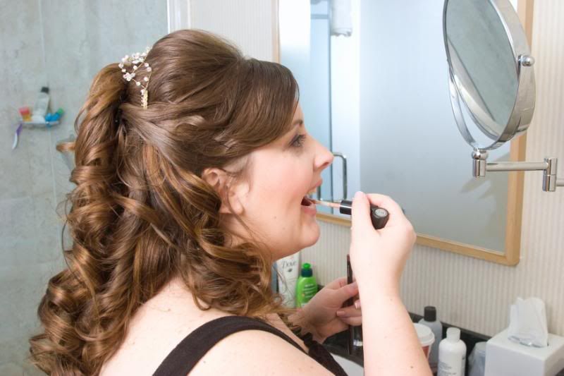 My hair looked amazing when she was finished and all day people were complimenting me on it. Most people didn’t even know I had extensions in. I do have to say though, by the end of the day, the extensions were really hurting my head and the curl was completely gone. This is the only reason I’m not giving her an A. My own hair held the curl pretty well, but the extensions were straight. Luckily, the day was so much fun that I really didn’t even worry about it. Here is a pic of my hair at the beginning of the day and how it looked by the end: