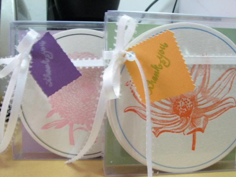 Favors were one of the hardest decisions we made. Everything we saw on wedding/bridal websites, we didn’t like and I was adamant that the favors be something that people might actually use once they got home. I have nothing against traditional favors, we just wanted something slightly different. Somehow, I stumbled upon coasters by Sesame Letterpress when looking around the web one day. I loved that they had all different patterns and that the company was started by a couple in Brooklyn. After ordering a couple sets as samples and loving them, I contacted the owner of the company and told him we’d like to use them for our favors. He was super easy to work with and offered us a great price! They are an awesome company and if I had found them earlier I probably would’ve spent the money to have them do letterpress invites for us! This photo really does them no justice but it is the only one I have: