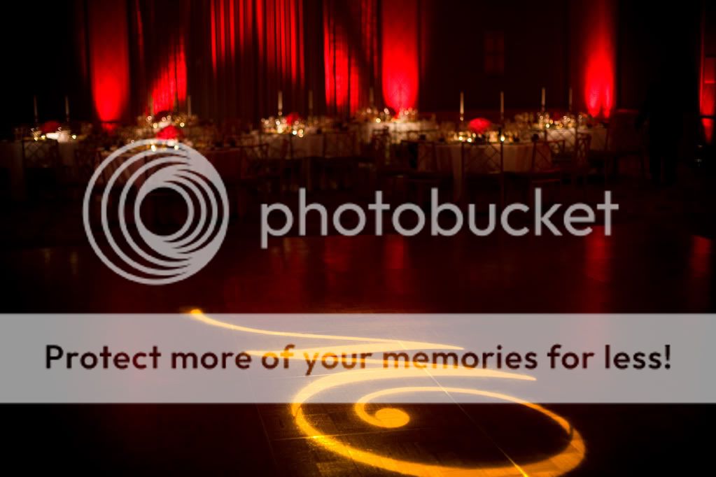 I worked with Glen from Get in Tune Productions. They did spot lights on all of our centrepieces, plus did a “W” logo on the dance floor for my husband’s last name and all around the room it was red uplighting. There are some pictures of the lighting down below. Glen went out of his way to be helpful and was a pleasure to deal with. I highly recommend him.