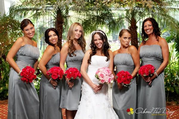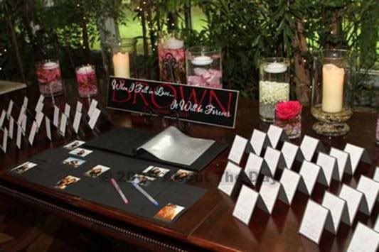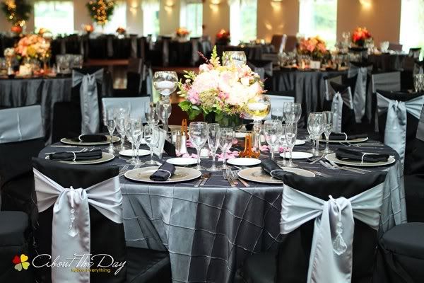 When I went to her I knew exactly what I wanted as far as decor. I didn't want just white or ivory tablecloths. I wanted the room to be dramatic. The wow factor. I wanted charcoal gray linens, crystals hanging from the covered chairs, rhinestone napkin holders, pewter chargers, tall candle holders with floating candles. I walked into her shop and told her all of this and she said with confidence, I'll get you everything you want. So, I had her do our linens, chair covers, etc. and of course, the flowers.