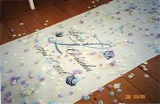 So pretty! Erin did a fantastic job, the runner was lovely. After you place your order she emails you with various “mock ups” so you can pick the exact design you want. I told her the colors, style, etc and she came up with some great choices for me. We added a few graphics at very little extra. Her work is fabulous and the finished product is great-we received so many compliments on our runner. If you use Erin, you cannot wait until the last minute. She only accepts a few orders at a time. Once you place your order, she puts you on her schedule and she will tell you when to expect your runner. She says to allow up to six weeks-though I got mine in about 4 weeks. Total cost was $120.