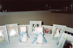 We had personalized M&Ms wrapped in tulle, placed in crystal Mikasa candy dishes as our favor. The personalized m&ms are a little pricey-you can order non-personalized ones in your wedding colors for a lot less. So, we did half and half-all in light blue, white and lavender. They took about 2 weeks to come in, though if it were around a holiday, I would probably allow more time. A few came in chipped and on some the printing was a little blurred but for the most part they were really cute. We had some printed with our names, others with our wedding date, others with “I DO” and other miscellaneous wedding phrased we thought of. M&Ms are dear to the heart on my mother’s side of the family (won’t bore you with the “why”) but these were a big hit.