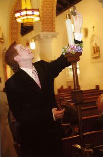 Our wedding fell during 'Easter' for the church so we had the opportunity to use the pew candles they used during this season, I was very excited about this as it went with all our other candle stuff. Father Ralph did an amazing job, everyone told our parents that the ceremony was beautiful-half of our guests cried (big babies