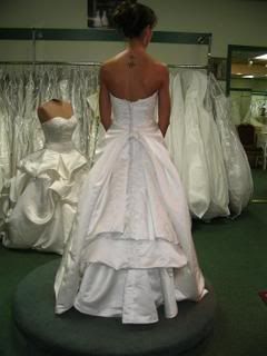 The next appointment was a fiasco. I sat with my BMs waiting for over and hour to find out that they hadn’t started their bustles (this is their last fitting appt) and right before I am set to go in I find out that nothing had been done to my dress. This is one week before my wedding. With everything else I wanted a final before my final-there was NO WAY I was going to go for my final and not know that the dress was perfect. After throwing a fit in the store (and I mean yelling, cursing and throwing a temper tantrum) they gave me an appointment to come in that Saturday morning before they opened. It was done-I put it on and it was perfect. Except the dress was still off center-I mentioned this to the seamstress and instead of her telling me I was crazy she pulled out a measuring tape and low and behold it was off an inch and a half! She re-centered it and I had my final Wednesday before the wedding.