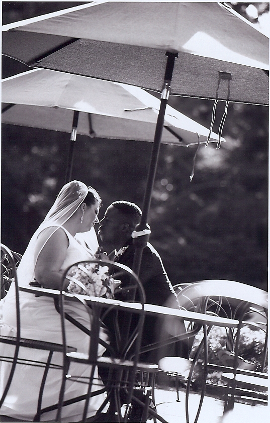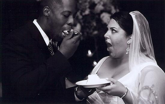 So… the cake was not included at deSeversky and 1 of their house vendors was Leonetties, DH and I have been there before for Gelato, so we knew of the place. We called and asked if we could come in for a cake tasting… he then proceeded to ask me which flavors we would like to taste, in which I told him. We went their for our meeting and he comes out with these 2 cakes (the size of the top of wedding cakes) for us to take home to our families and try… I was in shock! Before we went to Leonetties we went somewhere else that was recommended to us for a cake tasting and she cut this little stale pc of cake, and continued to spread some jam on it… it tasted horrible and it was no bigger then the nail on my thumb. This is why I was in such shock when Serverio the owner of Leonetties came out with these 2 big cakes for us to take home.., He really is such a sweet man. After we all tasted the cake, we decided on the flavors and went back to order them. In addition to the wedding cake, we wanted to have a mini Viennese… we didn’t want a huge Viennese because we felt like the food was always wasted at the end because it is just too much, and we didn’t want the people to have to go and get their desert, so we decided to have a mini Viennese for each person on their plate. So each person then got 1 Choc Covered Strawberry, a scoop of gelato, a pc of wedding cake, a pc of the grooms cake. Plus then in the center of the table there were a plate of pastries and the homemade cookies (which were forgotten but that wasn’t Leonetties fault). I heard that everything was amazing… people loved the fact that they had so much to chose from for dessert! I saw the plates and they looked amazing! Leonetties really did such an amazing job! Everything was delivered on time, and looked and tasted amazing. The one thing that I did hear is that the some of the pastries, I heard this from 2 people, tasted a little freezer burned, now I cannot say whos fault that is… it could have been Leonetties, and it could have been deSeversky’s maybe storing them incorrectly… who knows. All I know is that everything looked amazing, and I heard nothing but rave reviews for everything else. Our Cakes were delicious… which is why Dwayne forgot to feed ME THE CAKE, and took the bit for himself… you can see my face of shock in the picture below… He wanted more he said it was so good. His grooms cake was a carrot cake which I heard was also delicious!
