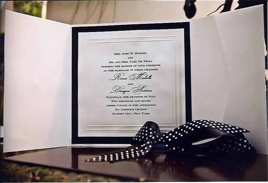 We then bought the pocket folds, envelopes for the pocket folds, black background cards, and cardstock from Paper presentation in NYC. We designed the OOT card, the deSeversky History Card and the direction card ourselves and printed them out. We glued the main invitation ordered from Just announce it on the black background, and then glued it into the pocket fold. We wrapped each invite in our Black ribbon, and our Black and White Polka dot ribbon for the finishing touch and presto! We printed our envelopes in our printer. We loved the final product!
