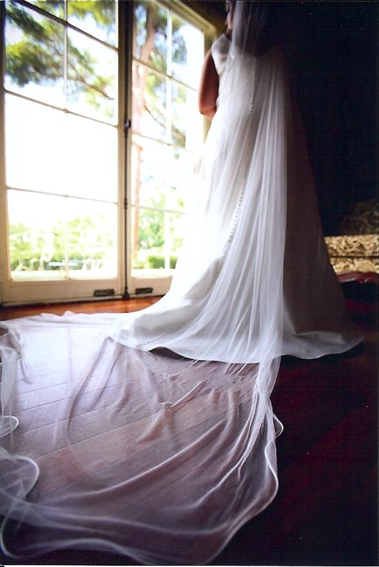 I always wanted a real silk veil, and couldn’t find one anywhere in NY… so the next best thing was to have one made. I learned about Sew Deb here on LI Weddings, I ordered the silk Tulle for my 2 veils, 1 cathedral length for the ceremony and pictures, and 1 elbow length for the reception if I chose to wear it. I called Hannsons in England and ordered swatches of the colors available in the silk tulle, ordered my tulle and they shipped it directly to Sew Deb. I ordered my Veil I think in March and received it June. Yes… it took much longer then expected BUT… I kept letting her know that it was ok because I know she had prom season and was going crazy with that in addition to communion season… plus I didn’t really need it until July so what was the point of me having it in my house for my cats to claw at. I received the veil; it was EXACTLY what I wanted!!! I hung it out at my mothers house so there wouldn’t be any wrinkles… they were perfect! I actually wound up wearing the elbow length veil for the entire reception… that’s how much I loved them!