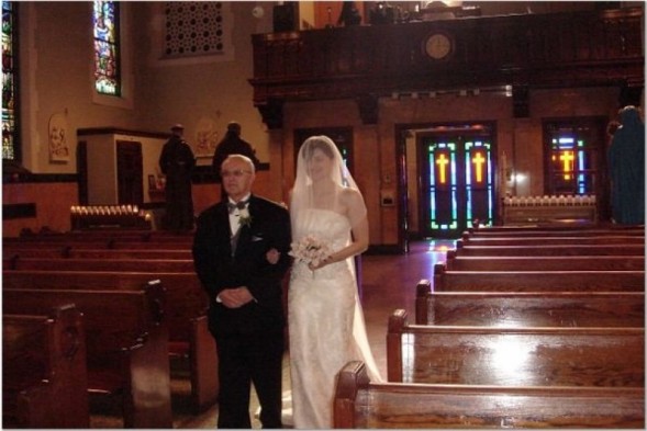I LOVED my veil. It was a cathedral length veil with a fingertip blusher made of ivory silk tulle. I felt like a queen wearing it. It was a pain sometimes walking around NYC with it, but I didn’t care!!! I loved the whole experience of being a bride and I lived it up!! If you want a cathedral veil – GET IT. Don’t worry about it being annoying, in the way, etc. It’s only one day in your life!!!