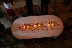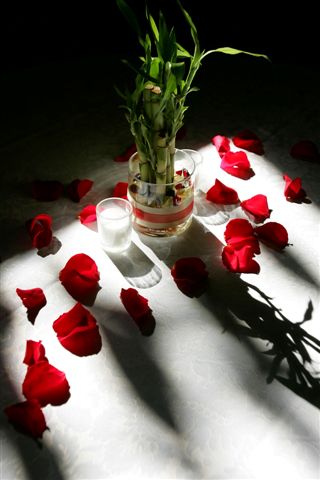 Thank you so much!Sorry I forgot to post the picture of the centerpieces. We did it very simply - just Chinese lucky bamboos in clear containers with red and gold ribbons around them (our wedding colors were red and gold because they are traditional Chinese wedding colors), red rose petals, and candles.