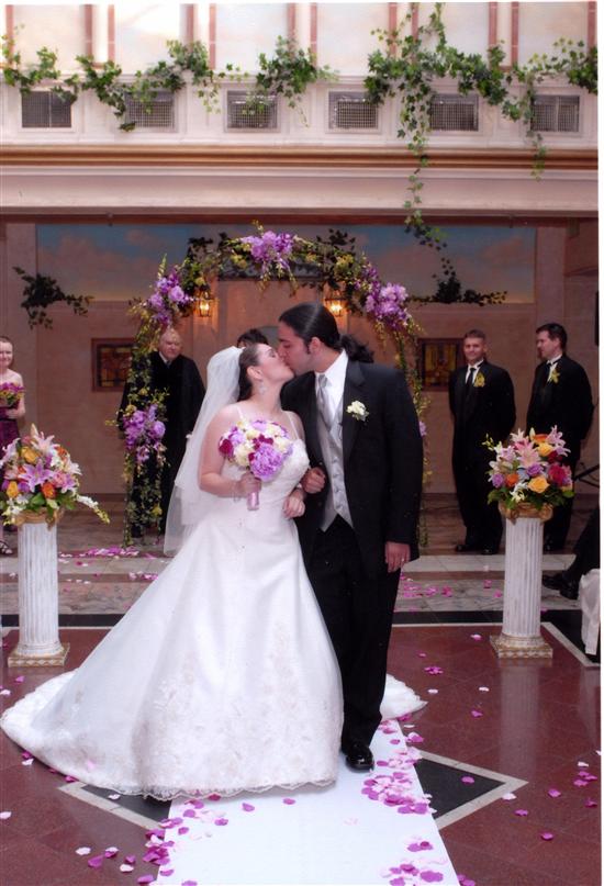 We didn't want to use Jericho Terrace's iron canopy for our ceremony, because we felt it was too enclosed, and looked to much like a chuppah. We wanted our ceremony to remain mostly civil, with a few traditions for our families. But, we still wanted some sort of decoration at the front of the ceremony room. John suggested using his floral arch. He did such a fabulous job with it! It looked soooo beautiful. The other ceremony flowers on the columns lining the aisle were also gorgeous, but they were not exactly what I had expected. We had talked about using pastels, and I thought that meant pastel versions of the reception colors, which were pinks and greens. These were pastel pinks, orange, yellow, blue, and green. Looking back in the pictures, they really were beautiful ceremony flowers, and they looked really nice in the Skylight room of Jericho Terrace. They really gave it some color, and coordinated nicely with the wall paintings. So I was very happy with them, even if I did not expect them.